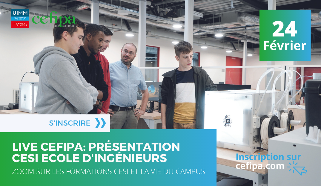 Vous avez découvert CESI École d’Ingénieurs, découvrez maintenant les deux autres écoles d’ingénieurs d’excellences, partenaires du cefipa : Le Conservatoire national des arts et métiers – CNAM et l’EPF École d’Ingénieurs. Au cours de ce Live vous pourrez assister à un zoom sur les formations d’ingénieurs proposés par ces écoles d’excellences dans le cadre du cefipa en compagnie de nos responsables pédagogiques. Nous vous présenterons également toutes les modalités d’admissions pour intégrer le CNAM ou l’EPF,  les débouchés de nos formations d’ingénieurs et enfin, une vision de la vie étudiante […]